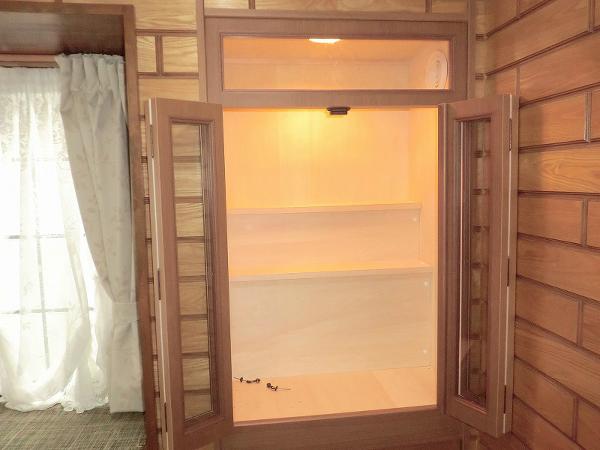 ガラス折り戸に照明付きでホコリが入らず、中は明るくしました。