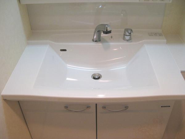 【施工後 洗面台】洗面ボウルは、アクリル100%人造大理石ボウルを使用しています。継ぎ目がなく、お手入れがとても簡単です。美しい光沢で変色の心配がありません。光沢と優れた耐久性の洗面ボウルです。