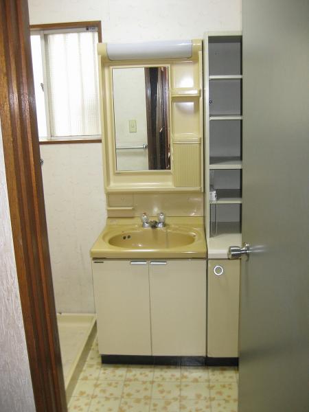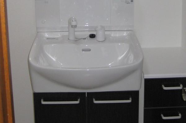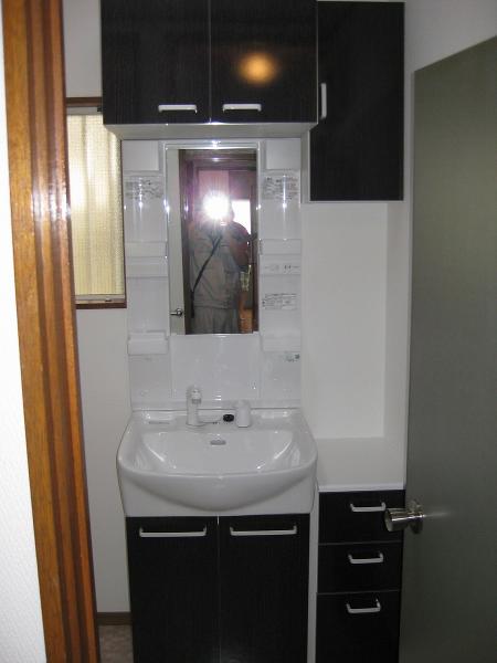 収納量が大幅にUP!木目調のブラウンのお色の洗面化粧台で高級感もでました。